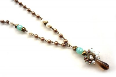Colar curto com pérolas marrom, cristal turquesa e gotinha de murano marrom.